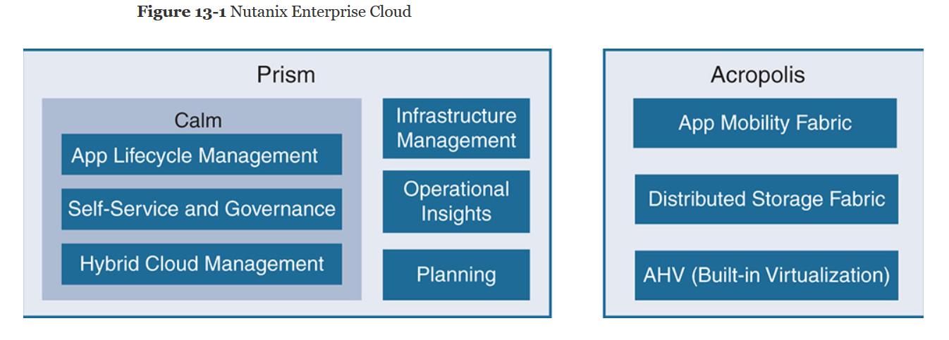 La Nutanix Enterprise Cloud Platform (ECP) è divisa in una suite di prodotti di gestione, pianificazione e automazione denominata Prism e una suite di prodotti di storage virtualizzati e definiti dal software denominata Acropolis. Il portafoglio cloud aziendale di alto livello di Nutanix è illustrato nella Figura 13-1.
