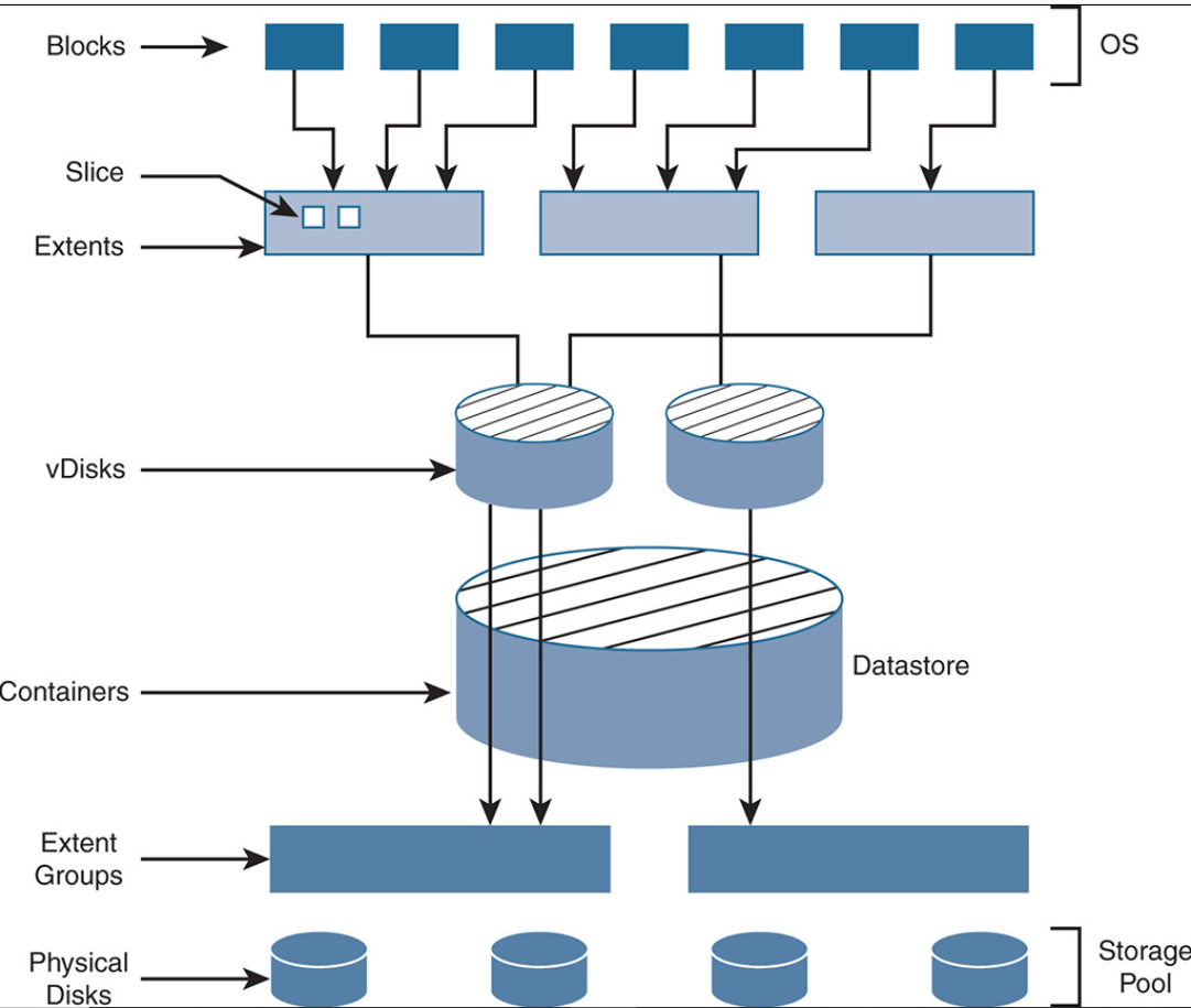 Extent store: questa è la parte dell’SSD o dell’HDD utilizzata per la memorizzazione persistente. Vale la pena notare che l’estensione dell’archiviazione in un nodo Nutanix potrebbe essere una combinazione di SSD e HDD per nodi ibridi o SSD solo per nodi all-flash. Questo è diverso da quello che hai visto con HyperFlex e vSAN, dove un nodo ibrido utilizza solo HDD per la capacità. Pertanto, l’architettura Nutanix per nodi ibridi ha un tocco di “storage tiering”, che è stato discusso nel Capitolo 2, “Storage Networks: Existing Designs”. Nel tiering dello storage, i trasferimenti di dati tra i livelli HDD e SSD dipendono dalla frequenza di accesso.