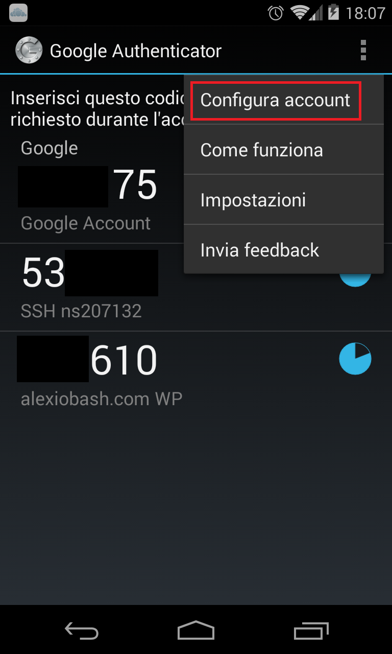 Apriamo l’applicazione G.A. sul nostro dispositivo mobile, andiamo su “Menu” -> “Configura Account”